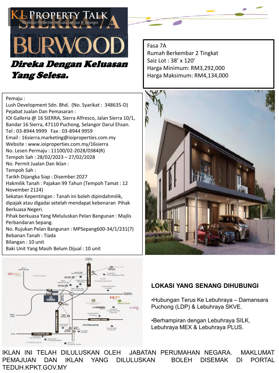 Burwood @ 16 Sierra in Selangor is an upscale residential development by one of Malaysia’s leading developers, IOI Properties. Situated in the vibrant town of Puchong, Burwood @ 16 Sierra houses are a sight to behold – sleek and stylish, combining modern architecture with a touch of nature. This exclusive community boasts only 102 units of luxury clustered homes, maintaining a sense of privacy and exclusivity for its residents. Each 2-storey home presents a spacious living environment, blending structural beauty with functionality.
